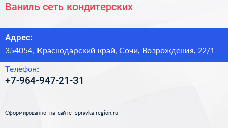 Ваниль, сеть кондитерских по адресу 354054, Краснодарский край, Сочи, Возрождения, 22/1 в дальнейшем Организация, размещена в следующих категориях: