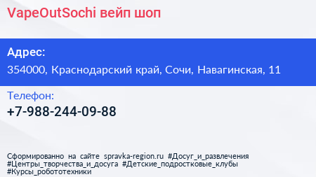 VapeOutSochi, вейп-шоп по адресу 354000, Краснодарский край, Сочи, Навагинская, 11 в дальнейшем Организация, размещена в следующих категориях: