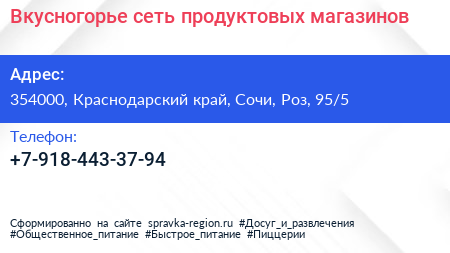 Вкусногорье, сеть продуктовых магазинов по адресу 354000, Краснодарский край, Сочи, Роз, 95/5 в дальнейшем Организация, размещена в следующих категориях: