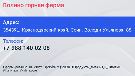 Волино, горная ферма по адресу 354391, Краснодарский край, Сочи, Володи Ульянова, 88 в дальнейшем Организация, размещена в следующих категориях: