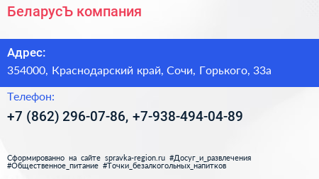 БеларусЪ, компания по адресу 354000, Краснодарский край, Сочи, Горького, 33а в дальнейшем Организация, размещена в следующих категориях: