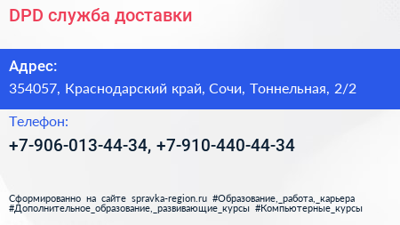 DPD, служба доставки по адресу 354057, Краснодарский край, Сочи, Тоннельная, 2/2 в дальнейшем Организация, размещена в следующих категориях: