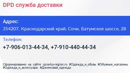 DPD, служба доставки по адресу 354207, Краснодарский край, Сочи, Батумское шоссе, 28 в дальнейшем Организация, размещена в следующих категориях: