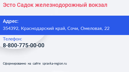 Эсто-Садок, железнодорожный вокзал по адресу 354392, Краснодарский край, Сочи, Омеловая, 22 в дальнейшем Организация, размещена в следующих категориях: