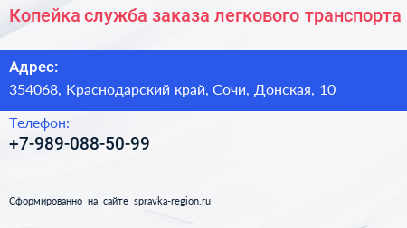 Копейка, служба заказа легкового транспорта по адресу 354068, Краснодарский край, Сочи, Донская, 10 в дальнейшем Организация, размещена в следующих категориях: