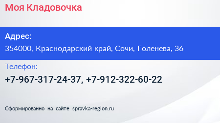Моя Кладовочка по адресу 354000, Краснодарский край, Сочи, Голенева, 36 в дальнейшем Организация, размещена в следующих категориях: