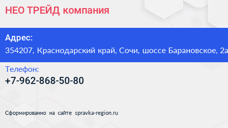 НЕО-ТРЕЙД, компания по адресу 354207, Краснодарский край, Сочи, шоссе Барановское, 2а в дальнейшем Организация, размещена в следующих категориях: