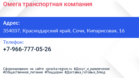 Омега, транспортная компания по адресу 354037, Краснодарский край, Сочи, Кипарисовая, 16 в дальнейшем Организация, размещена в следующих категориях: