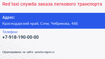 Red taxi, служба заказа легкового транспорта по адресу Краснодарский край, Сочи, Чебрикова, 46Б в дальнейшем Организация, размещена в следующих категориях:
