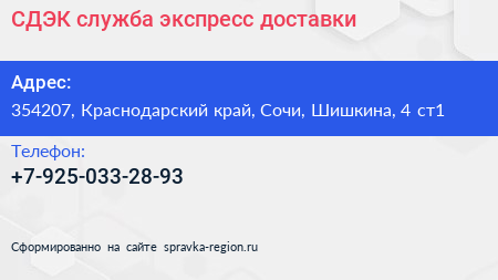 СДЭК, служба экспресс-доставки по адресу 354207, Краснодарский край, Сочи, Шишкина, 4 ст1 в дальнейшем Организация, размещена в следующих категориях: