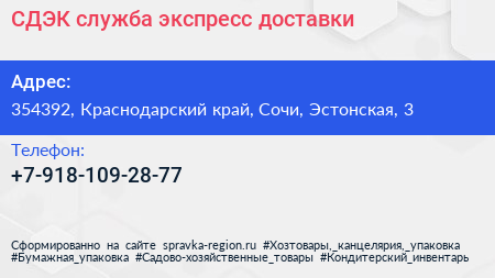 СДЭК, служба экспресс-доставки по адресу 354392, Краснодарский край, Сочи, Эстонская, 3 в дальнейшем Организация, размещена в следующих категориях: