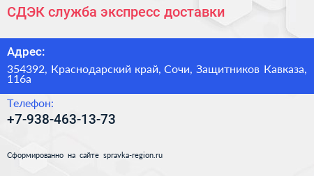 СДЭК, служба экспресс-доставки по адресу 354392, Краснодарский край, Сочи, Защитников Кавказа, 116а в дальнейшем Организация, размещена в следующих категориях: