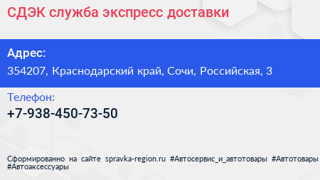 СДЭК, служба экспресс-доставки по адресу 354207, Краснодарский край, Сочи, Российская, 3 в дальнейшем Организация, размещена в следующих категориях: