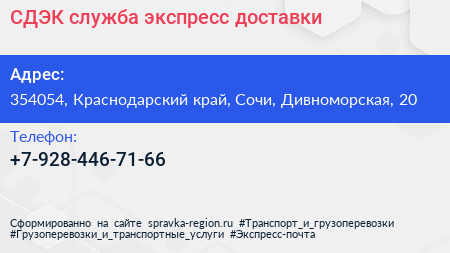 СДЭК, служба экспресс-доставки по адресу 354054, Краснодарский край, Сочи, Дивноморская, 20 в дальнейшем Организация, размещена в следующих категориях: