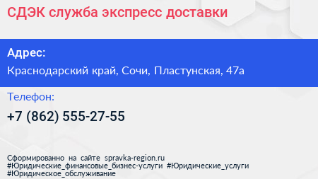 СДЭК, служба экспресс-доставки по адресу Краснодарский край, Сочи, Пластунская, 47а в дальнейшем Организация, размещена в следующих категориях: