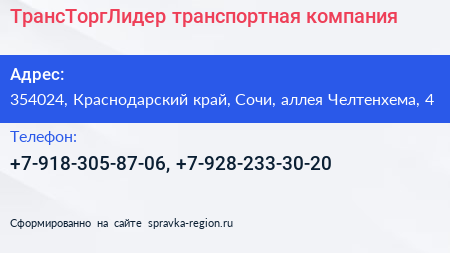 ТрансТоргЛидер, транспортная компания по адресу 354024, Краснодарский край, Сочи, аллея Челтенхема, 4 в дальнейшем Организация, размещена в следующих категориях: