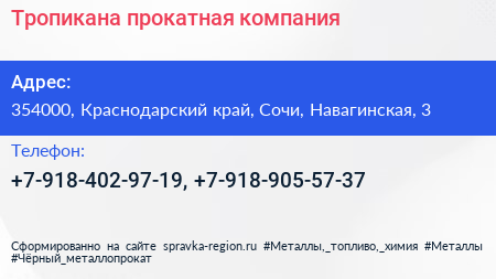 Тропикана, прокатная компания по адресу 354000, Краснодарский край, Сочи, Навагинская, 3 в дальнейшем Организация, размещена в следующих категориях: