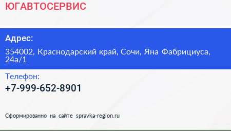 ЮГАВТОСЕРВИС по адресу 354002, Краснодарский край, Сочи, Яна Фабрициуса, 24а/1 в дальнейшем Организация, размещена в следующих категориях: