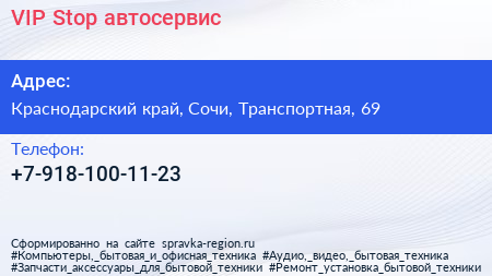 VIP Stop, автосервис по адресу Краснодарский край, Сочи, Транспортная, 69 в дальнейшем Организация, размещена в следующих категориях:
