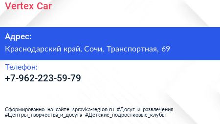 Vertex Car по адресу Краснодарский край, Сочи, Транспортная, 69 в дальнейшем Организация, размещена в следующих категориях: