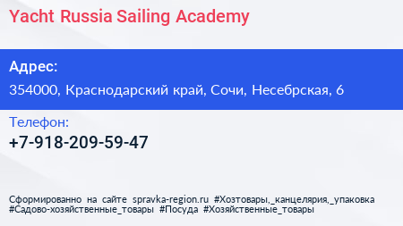 Yacht Russia Sailing Academy по адресу 354000, Краснодарский край, Сочи, Несебрская, 6 в дальнейшем Организация, размещена в следующих категориях:
