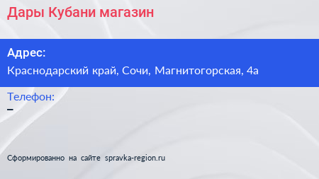 Дары Кубани, магазин по адресу Краснодарский край, Сочи, Магнитогорская, 4а в дальнейшем Организация, размещена в следующих категориях: