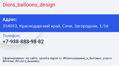Diora_balloons_design по адресу 354053, Краснодарский край, Сочи, Загородная, 1/16 в дальнейшем Организация, размещена в следующих категориях: