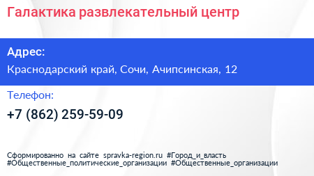 Галактика, развлекательный центр по адресу Краснодарский край, Сочи, Ачипсинская, 12 в дальнейшем Организация, размещена в следующих категориях: