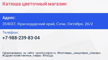 Катюша, цветочный магазин по адресу 354037, Краснодарский край, Сочи, Октября, 26/2 в дальнейшем Организация, размещена в следующих категориях: