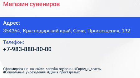 Магазин сувениров по адресу 354364, Краснодарский край, Сочи, Просвещения, 132 в дальнейшем Организация, размещена в следующих категориях: