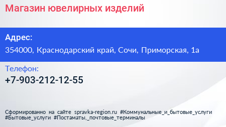 Магазин ювелирных изделий по адресу 354000, Краснодарский край, Сочи, Приморская, 1а в дальнейшем Организация, размещена в следующих категориях: