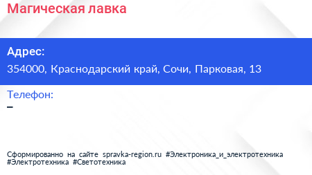 Магическая лавка по адресу 354000, Краснодарский край, Сочи, Парковая, 13 в дальнейшем Организация, размещена в следующих категориях: