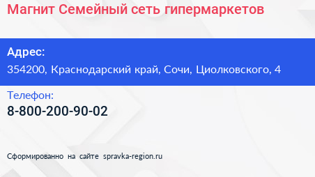 Магнит Семейный, сеть гипермаркетов по адресу 354200, Краснодарский край, Сочи, Циолковского, 4 в дальнейшем Организация, размещена в следующих категориях: