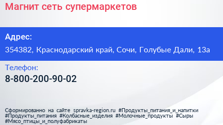 Магнит, сеть супермаркетов по адресу 354382, Краснодарский край, Сочи, Голубые Дали, 13а в дальнейшем Организация, размещена в следующих категориях: