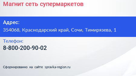 Магнит, сеть супермаркетов по адресу 354068, Краснодарский край, Сочи, Тимирязева, 1 в дальнейшем Организация, размещена в следующих категориях: