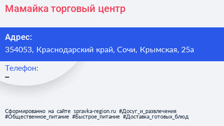 Мамайка, торговый центр по адресу 354053, Краснодарский край, Сочи, Крымская, 25а в дальнейшем Организация, размещена в следующих категориях: