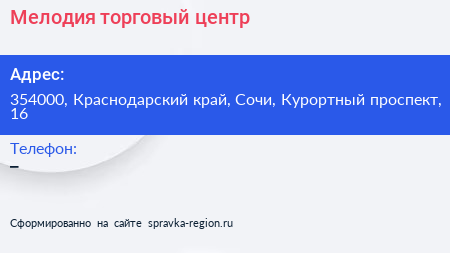 Мелодия, торговый центр по адресу 354000, Краснодарский край, Сочи, Курортный проспект, 16 в дальнейшем Организация, размещена в следующих категориях: