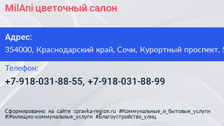 MilAni, цветочный салон по адресу 354000, Краснодарский край, Сочи, Курортный проспект, 5 в дальнейшем Организация, размещена в следующих категориях: