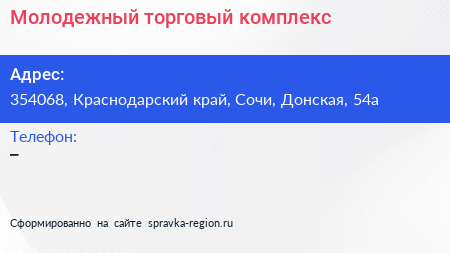 Молодежный, торговый комплекс по адресу 354068, Краснодарский край, Сочи, Донская, 54а в дальнейшем Организация, размещена в следующих категориях: