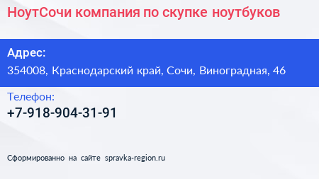 НоутСочи, компания по скупке ноутбуков по адресу 354008, Краснодарский край, Сочи, Виноградная, 46 в дальнейшем Организация, размещена в следующих категориях: