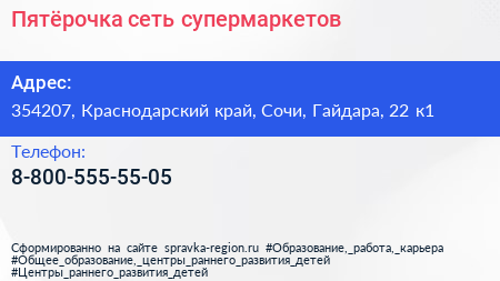 Пятёрочка, сеть супермаркетов по адресу 354207, Краснодарский край, Сочи, Гайдара, 22 к1 в дальнейшем Организация, размещена в следующих категориях: