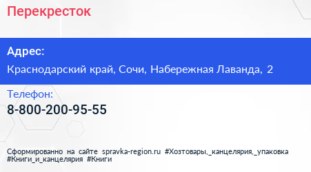 Перекресток по адресу Краснодарский край, Сочи, Набережная Лаванда, 2 в дальнейшем Организация, размещена в следующих категориях: