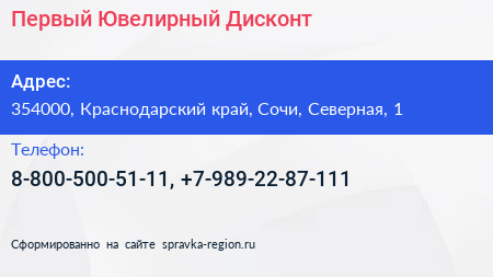 Первый Ювелирный Дисконт по адресу 354000, Краснодарский край, Сочи, Северная, 1 в дальнейшем Организация, размещена в следующих категориях: