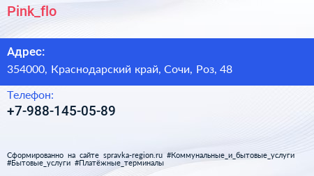 Pink_flo по адресу 354000, Краснодарский край, Сочи, Роз, 48 в дальнейшем Организация, размещена в следующих категориях: