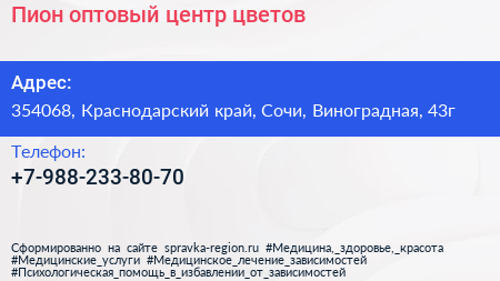 Пион, оптовый центр цветов по адресу 354068, Краснодарский край, Сочи, Виноградная, 43г в дальнейшем Организация, размещена в следующих категориях: