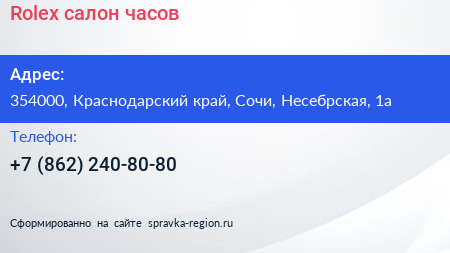Rolex, салон часов по адресу 354000, Краснодарский край, Сочи, Несебрская, 1а в дальнейшем Организация, размещена в следующих категориях: