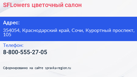 SFLowers, цветочный салон по адресу 354054, Краснодарский край, Сочи, Курортный проспект, 105 в дальнейшем Организация, размещена в следующих категориях: