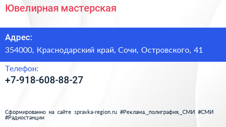 Ювелирная мастерская по адресу 354000, Краснодарский край, Сочи, Островского, 41 в дальнейшем Организация, размещена в следующих категориях: