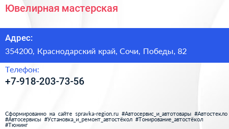 Ювелирная мастерская по адресу 354200, Краснодарский край, Сочи, Победы, 82 в дальнейшем Организация, размещена в следующих категориях: