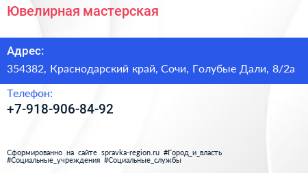 Ювелирная мастерская по адресу 354382, Краснодарский край, Сочи, Голубые Дали, 8/2а в дальнейшем Организация, размещена в следующих категориях: